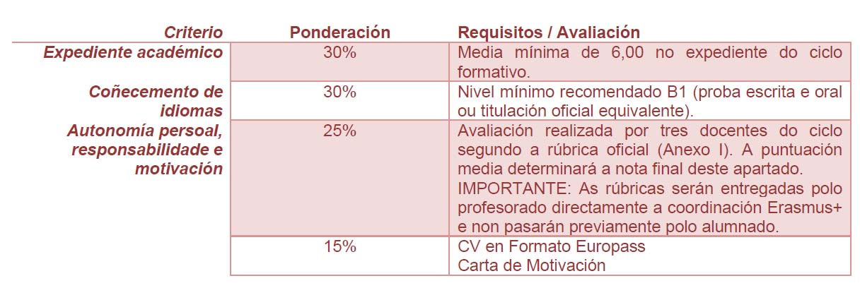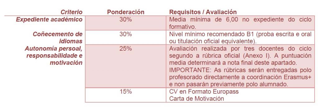 Criterios de selección e valoración dos candidatos