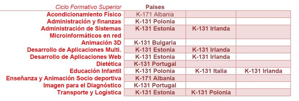 Os destinos habituais inclúen: Portugal, Italia, Polonia, Estonia, República Checa e Irlanda, aínda que poderán considerarse outros países con convenio Erasmus+ vixente. O equipo docente e o titor/a, xunto coas coordinadoras Erasmus+, determinarán o país e a empresa de destino en función do perfil do alumnado. Valorarase positivamente que o alumnado aporte unha carta de aceptación dunha empresa externa ao listado proposto polo Departamento Erasmus.