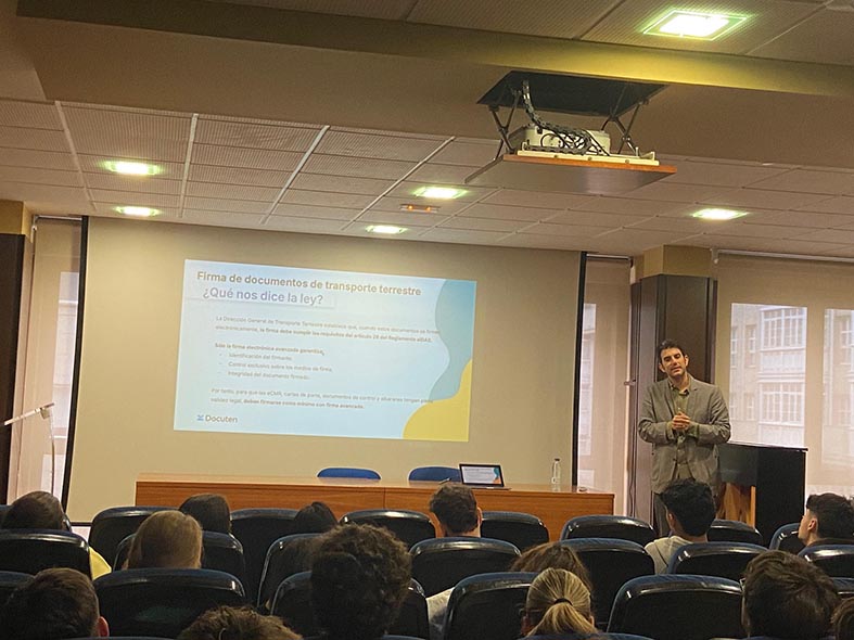 Además, profundizó en normativas clave como eIDAS, eFTI y la Ley de Movilidad Sostenible, destacando la relevancia de la digitalización del CMR como motor de eficiencia y sostenibilidad. Su propuesta para el sector del transporte — que combina trazabilidad completa, agilización de la facturación e integración directa con ERP mediante API — evidencia cómo la innovación puede mejorar procesos sin requerir que los conductores incorporen nuevas aplicaciones en su operativa diaria.