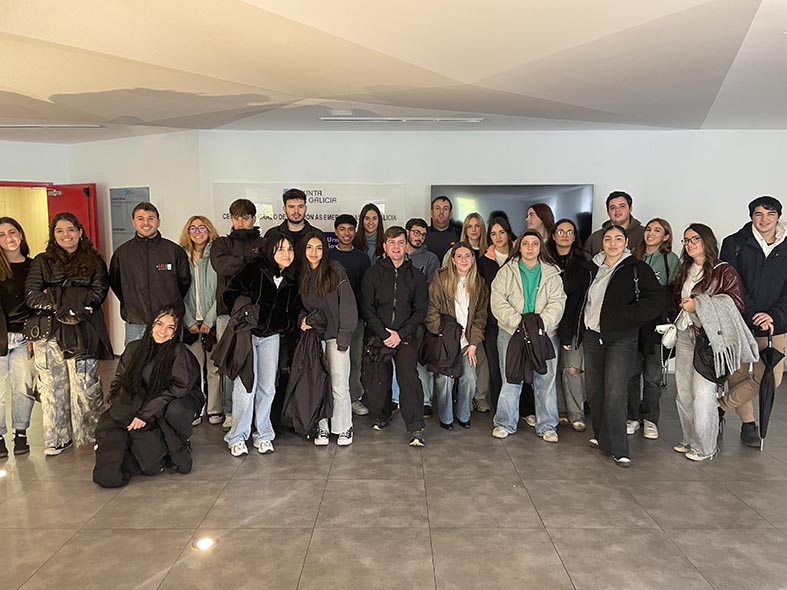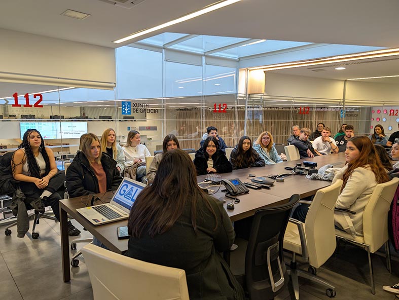 Charla y recorrido por las instalaciones del 112 Galicia, con una trabajadora del servicio 112 que ofreció una presentación sobre la estructura del centro, su funcionamiento, la recepción de llamadas y la coordinación de actuaciones. Posteriormente, los alumnos recorrieron las instalaciones para conocer la sala de control y los sistemas tecnológicos utilizados. El centro está gestionado por la Axencia Galega de Emerxencias (AXEGA), que integra los servicios de emergencias, seguridad ciudadana y atención sanitaria desde una plataforma operativa única.